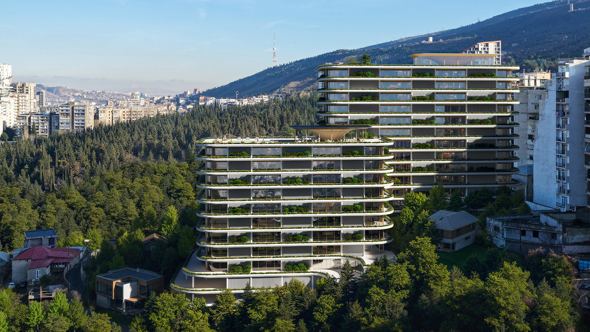 A defining element of the design is the lush, integrated greenery that wraps around every level of the building. These continuous terraced gardens act as a vertical forest, softening the stone and glass edges while providing a natural cooling effect for the residents. This not only enhances the building’s organic beauty but also ensures that the project feels like a natural extension of the hillside, offering a private, green greenery in the heart of the city.